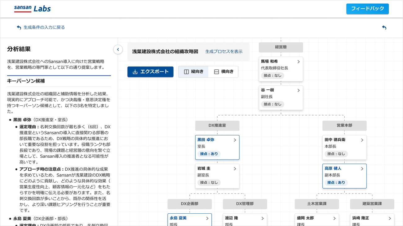 自社の誰がキーパーソンと接点を持っているのかを可視化し、アプローチ方法や具体的なアクションプランを提示する。属人的になりがちな人脈活用を仕組み化し、組織として再現性のある営業活動を可能にする。なお同機能は、「Sansan Labs」の一機能として提供する(※)。