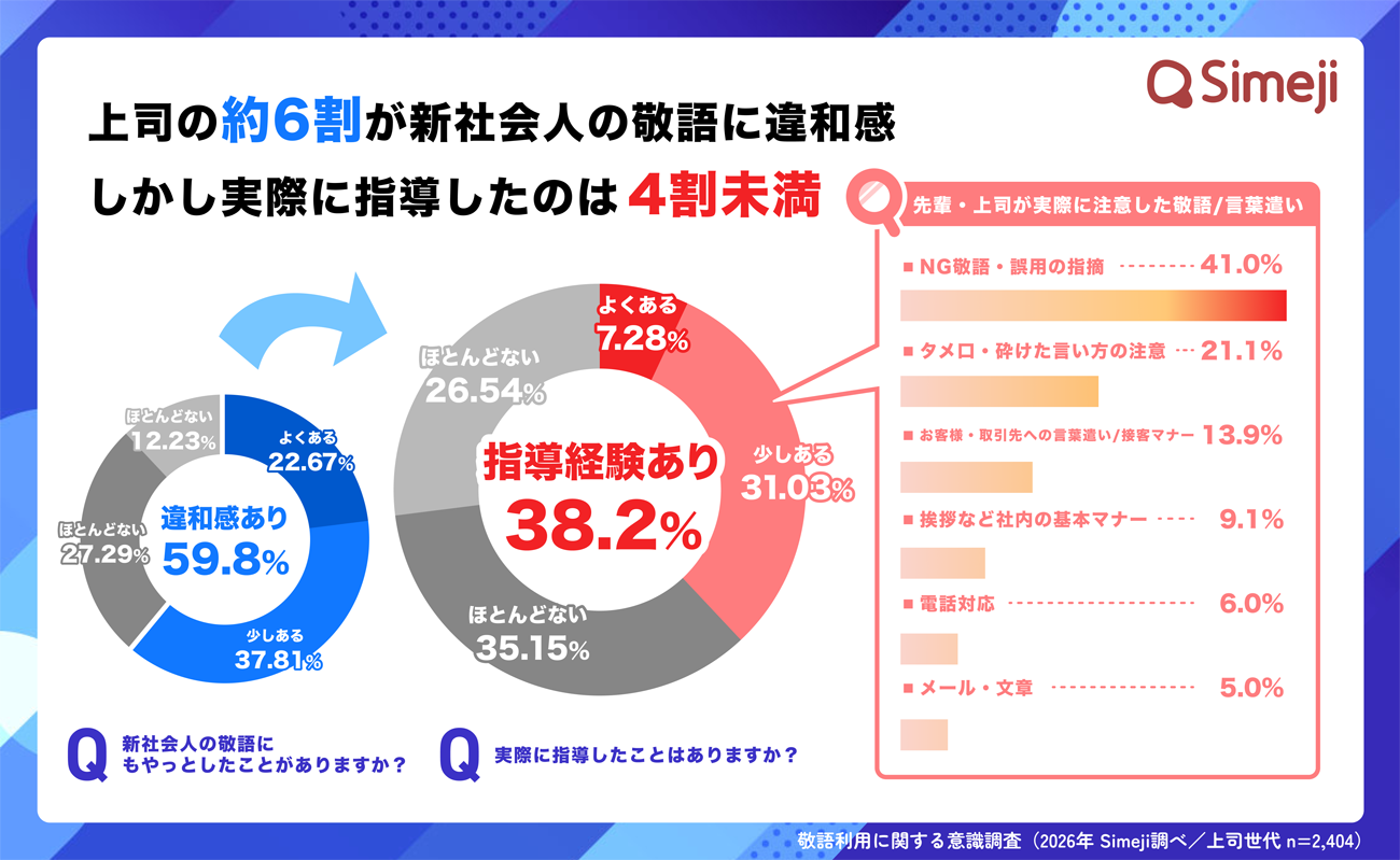 「上司・先輩の立場にある」と回答した人に「新社会人の敬語にモヤっとしたことがあるか」をたずねたところ、59.8%が「ある」と回答した。一方で、「実際に敬語の間違いを指導したことがある」と回答した人は38.2%(約4割)という結果になった。