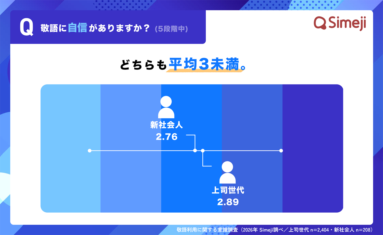 「敬語に自信がありますか?」(5段階評価)と質問したところ、新社会人(入社1年め)の平均は2.76ポイント、上司・先輩世代でも2.89ポイントと、いずれも5段階中3ポイント未満となった。