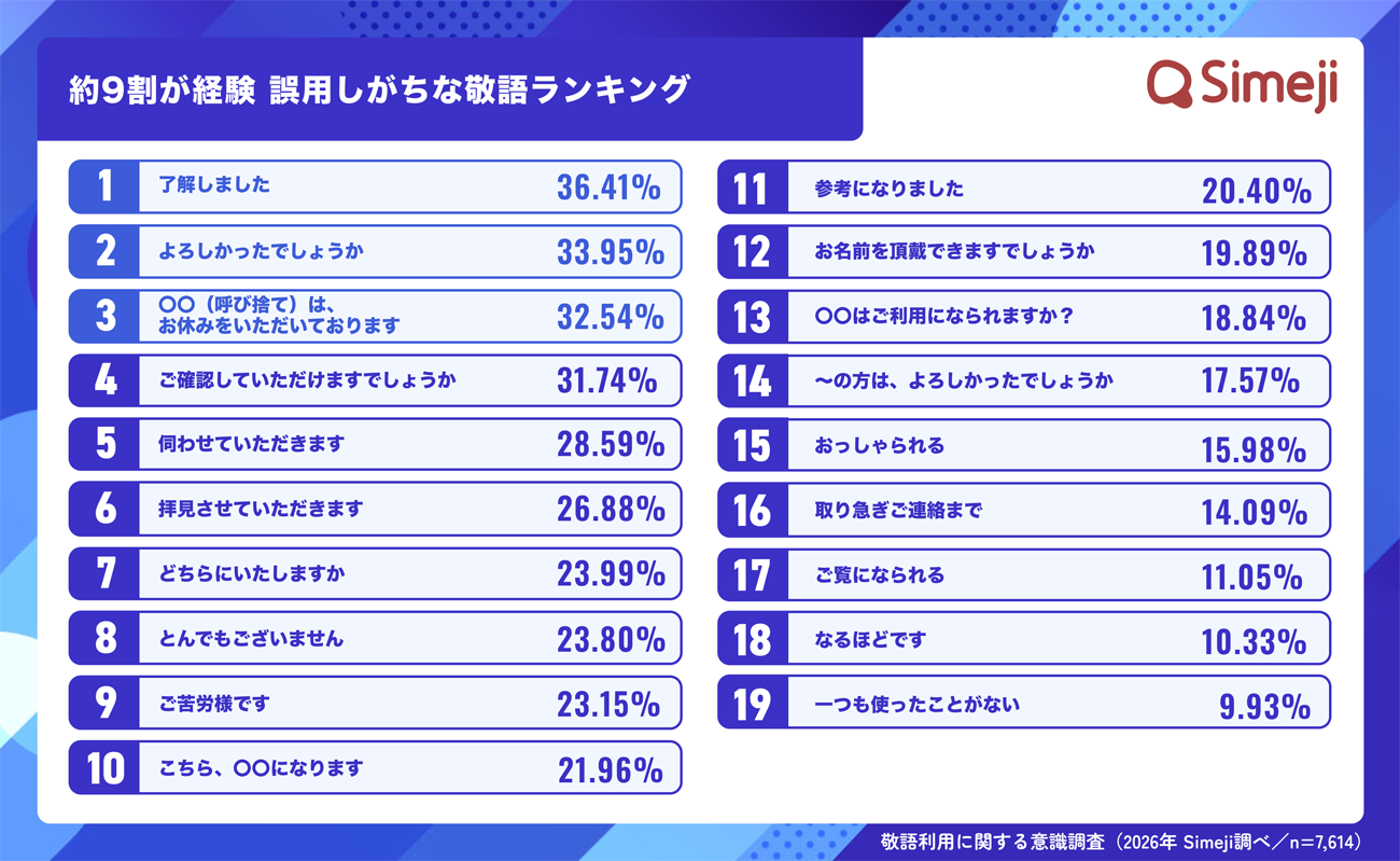 バイドゥが提供するきせかえ顔文字キーボードアプリ「Simeji」(iOS/Android版)は、19〜50歳を対象に「ビジネス敬語」に関する意識調査を実施した。