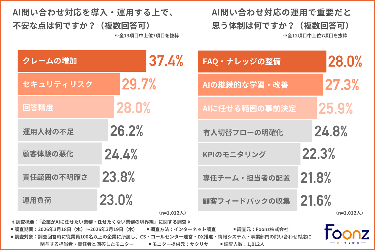 Foonzは、従業員100名以上の企業に所属し、CS・コールセンター運営・DX推進・情報システム・事業部門の問い合わせ対応に関与する担当者・責任者を対象に、「企業がAIに任せたい業務・任せたくない業務の境界線」に関する調査を実施した。