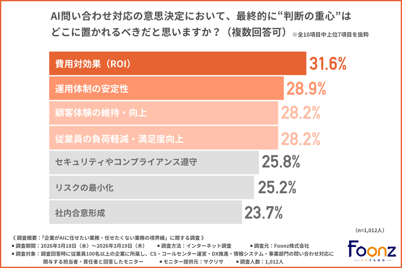 AI問い合わせ対応の意思決定、約3割の企業が“判断の重心”を「費用対効果(ROI)」に置いていると回答
