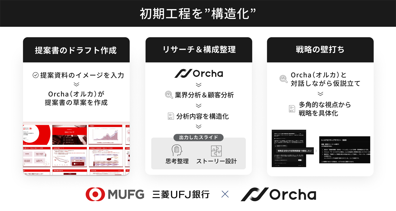 この課題に対応するため、三菱UFJ銀行では「Orcha」を活用し、リサーチから論点整理、構成検討、資料ドラフト作成までの一連のプロセスを一体で支援する仕組みの検証を進めてきた。