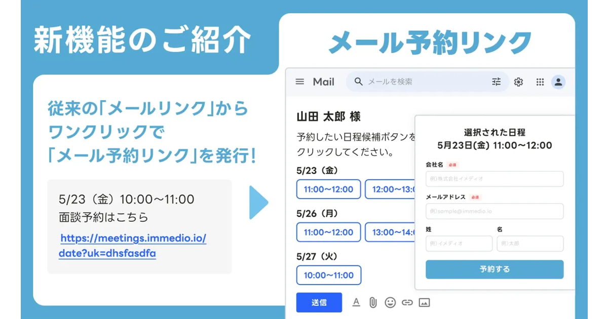 immedioは、提供するAIインサイドセールス「immedio(イメディオ)」において、メール上で商談の予約が完了する「メール予約リンク」機能の提供を開始した。