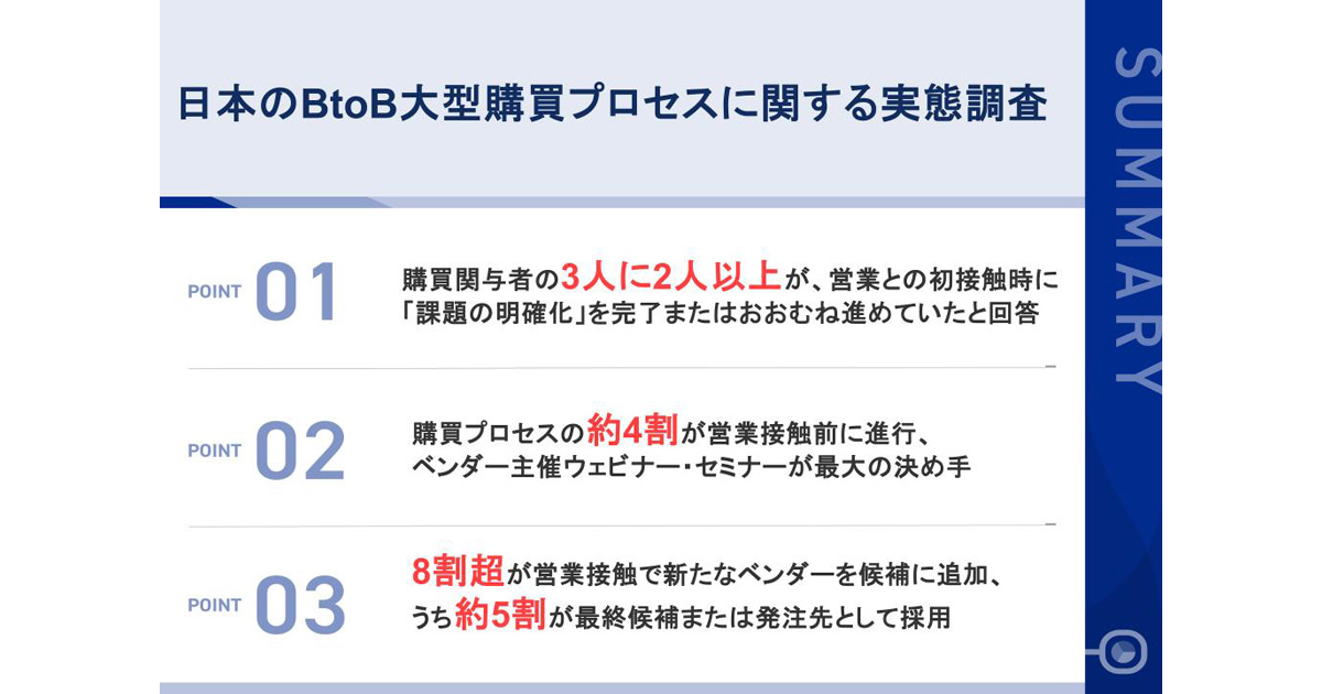 IDEATECHが提供する「リサピー」は、元Microsoft業務執行役員 北川 裕康氏(デマジェン総研)との共同調査として、直近12ヵ月以内に年間契約金額(または一括導入費用)が300万円以上のBtoB商材の導入・見直し・乗り換え・大型契約更新に2名以上で関与した、BtoB事業を展開する企業に勤務する会社員・経営者307名を対象に、日本のBtoB大型購買プロセスに関する実態調査を実施した。