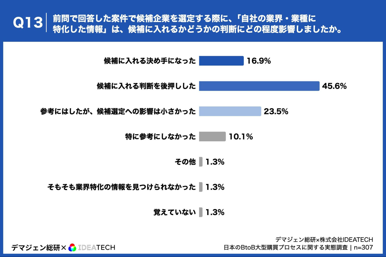「Q13.前問で回答した案件で候補企業を選定する際に、『自社の業界・業種に特化した情報』(業界特化の導入事例、同業種向け機能紹介、業界固有の課題解決事例など)は、候補に入れるかどうかの判断にどの程度影響しましたか。(n=307)」と質問したところ、「候補に入れる決め手になった」が16.9%、「候補に入れる判断を後押しした」が45.6%という回答となった。