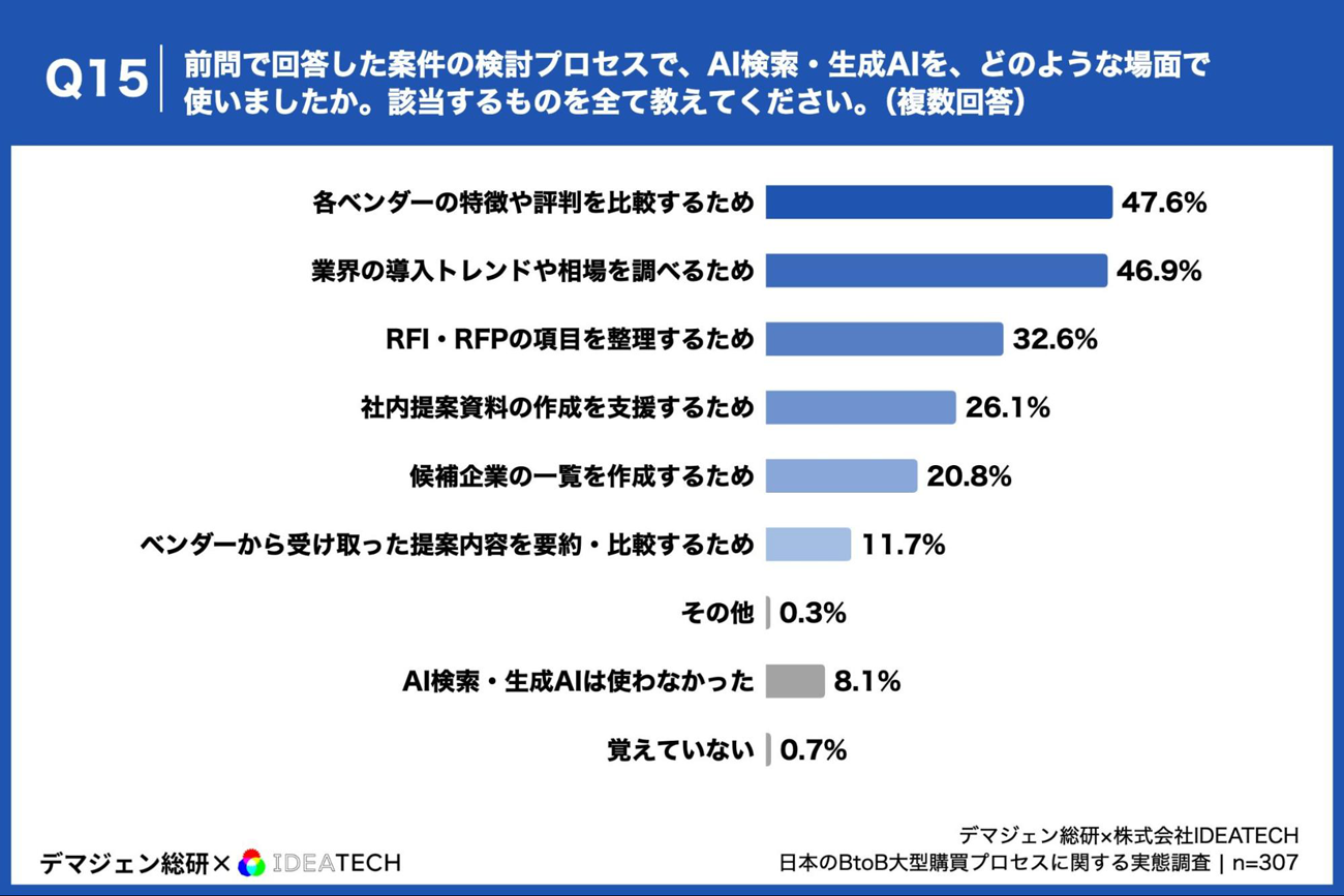 「Q15.前問で回答した案件の検討プロセスで、AI検索・生成AI(ChatGPT、Perplexity、Copilotなど)を、どのような場面で使いましたか。該当するものを全て教えてください。(複数回答/n=307)」と質問したところ、「各ベンダーの特徴や評判を比較するため」が47.6%、「業界の導入トレンドや相場を調べるため」が46.9%、「RFI・RFPの項目を整理するため」が32.6%という回答となった。