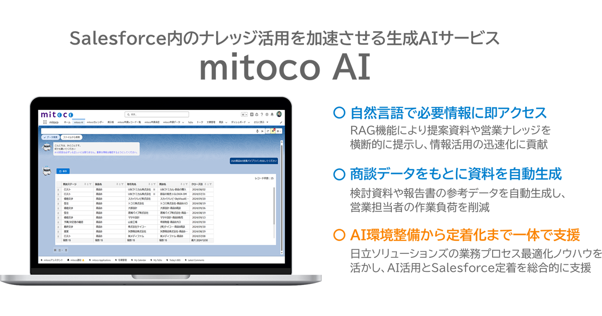 こうした背景から日立ソリューションズは、生成AIを活用したSalesforceのデータ活用や定着化支援を強化するため、テラスカイのmitoco AIの提供に至った。