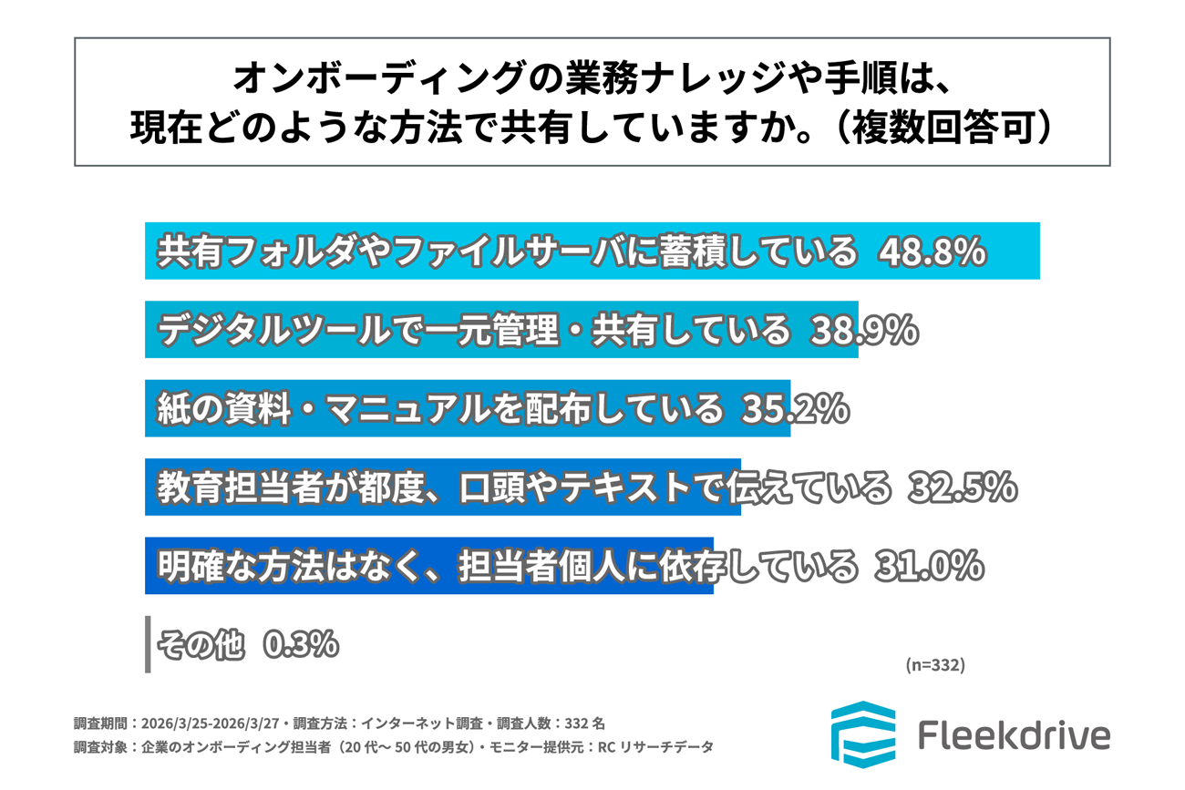 オンボーディングでの業務ナレッジや手順の主な共有方法は、「共有フォルダやファイルサーバへの蓄積」や「デジタルツールで一元管理・共有」