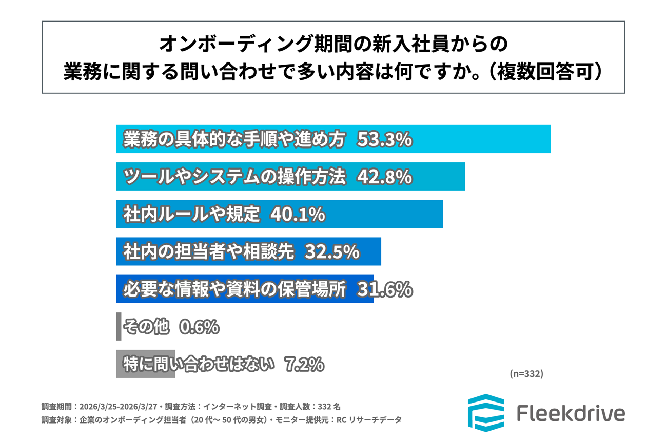 「オンボーディング期間の新入社員からの業務に関する問い合わせで多い内容は何か」を尋ねる設問への回答では、1位が「業務の具体的な手順や進め方」で53.3%、2位が「ツールやシステムの操作方法」で42.8%、3位が「社内ルールや規定」で40.1%という結果になった。この結果から、オンボーディング期間の新入社員からの問い合わせで最も多い内容は、「業務の具体的な手順や進め方」であることがわかった。