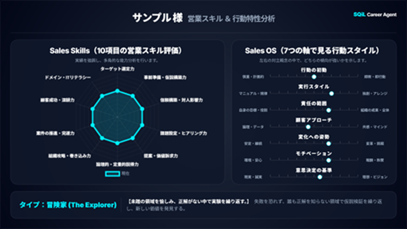 ミスマッチの根源を解消するため、求職者の現在地と企業の求める要件を「Sales Profile(条件)」「Sales Skills(10項目の実務スキル)」「Sales OS(7項目の志向性・カルチャー)」の3階層で分析する。その上で、10項目の「Sales Skills」と7項目の「Sales OS」、さらに分析結果から導き出される「16タイプの適性診断」を独自の「セールスバイタルシート」として可視化する。