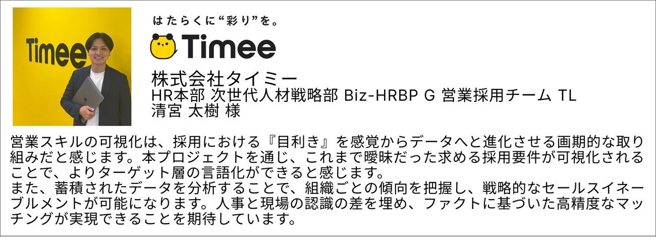 双方が共通の言語を持たず属人的な評価に頼った採用活動が行われていることに加え、組織のカルチャーや志向性の不一致が、長期的な定着と活躍を阻む要因となっている。この課題を解決し、営業スキルと志向性を明確な言葉と数字で証明するソリューションとして「Sales PRO-FIT」の開発に至った。